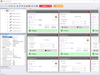 Once connected, all settings of attached SMD3s can be viewed and modified using the straightforward graphical user interface. Key figures including motor temperature, position and current are displayed on the device status window. Configure device options such as operation mode, motor currents and limits using the device properties window. The SMD3 can be operated standalone, without needing to be connected to a PC; using the joystick or SDE (step, direction, enable) interface, once your parameters are saved to the device.