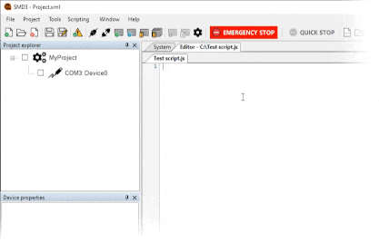 The SMD3 software includes an easy to use script editor, that allows for sequences to be programmed and executed on multiple connected SMD3 devices, as well as system level operations such as adding and removing SMD3 devices from the project.