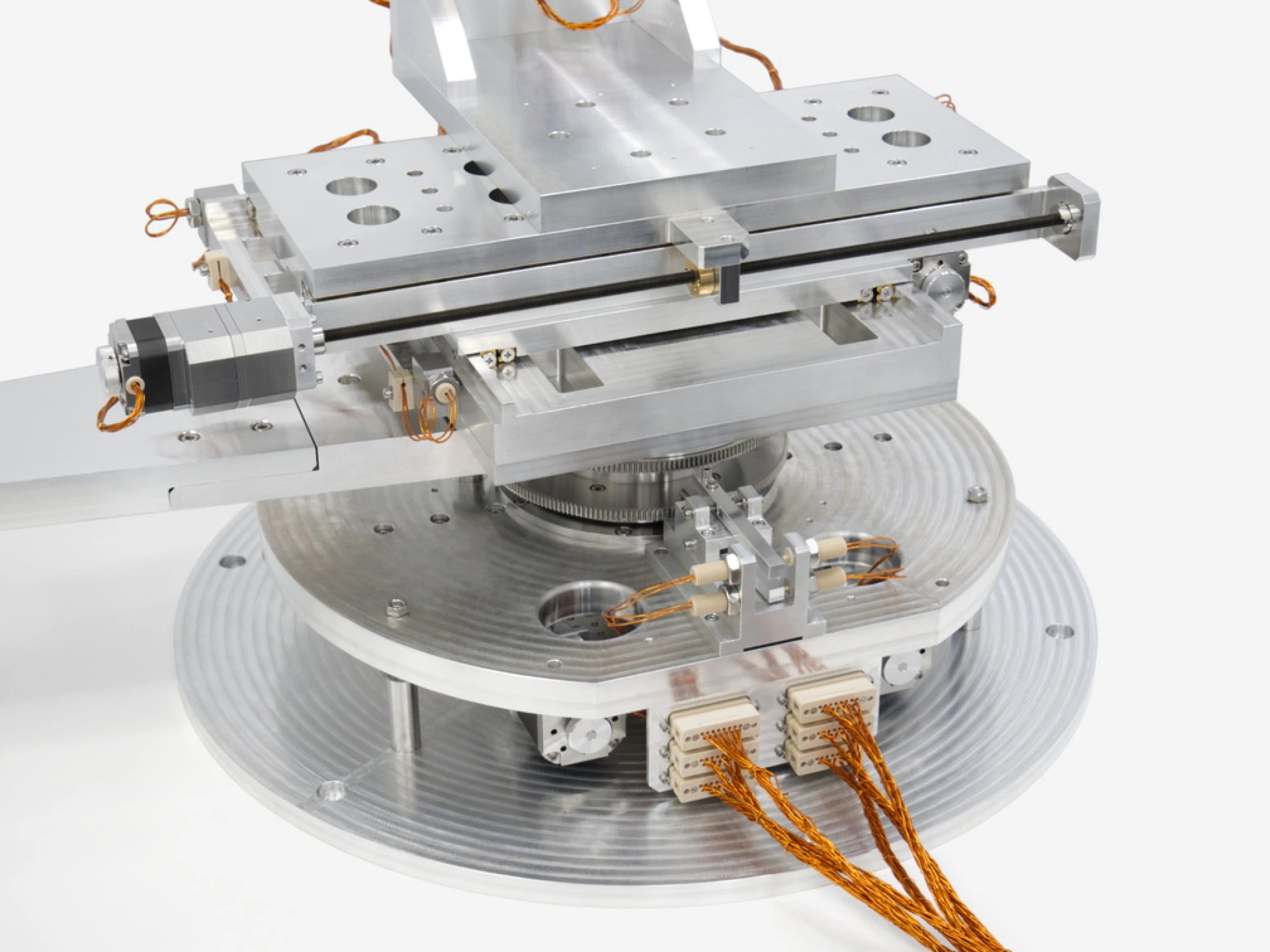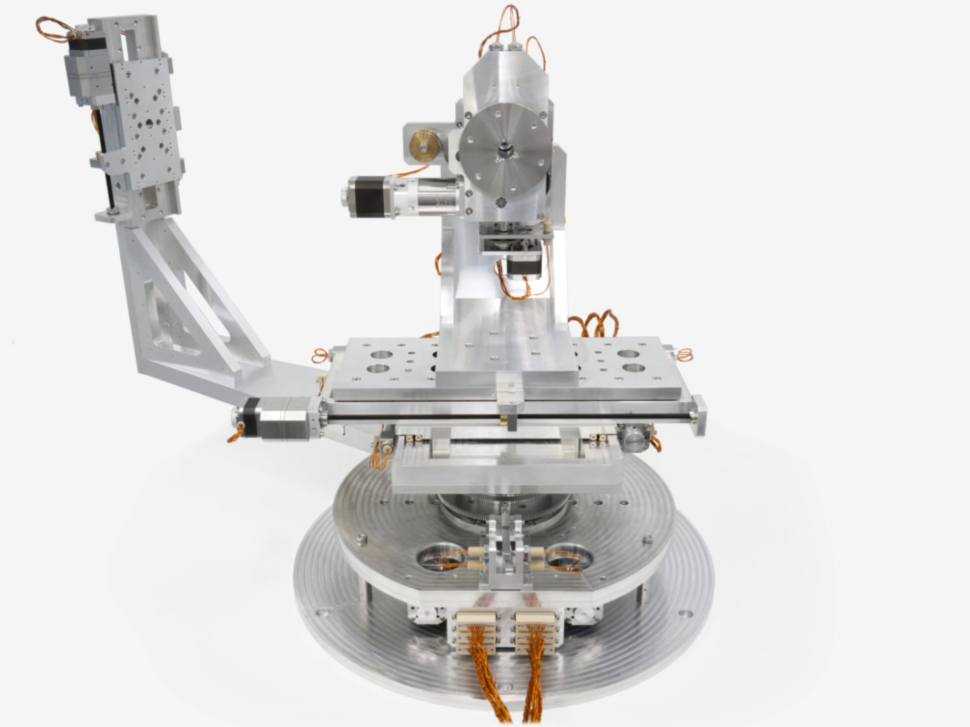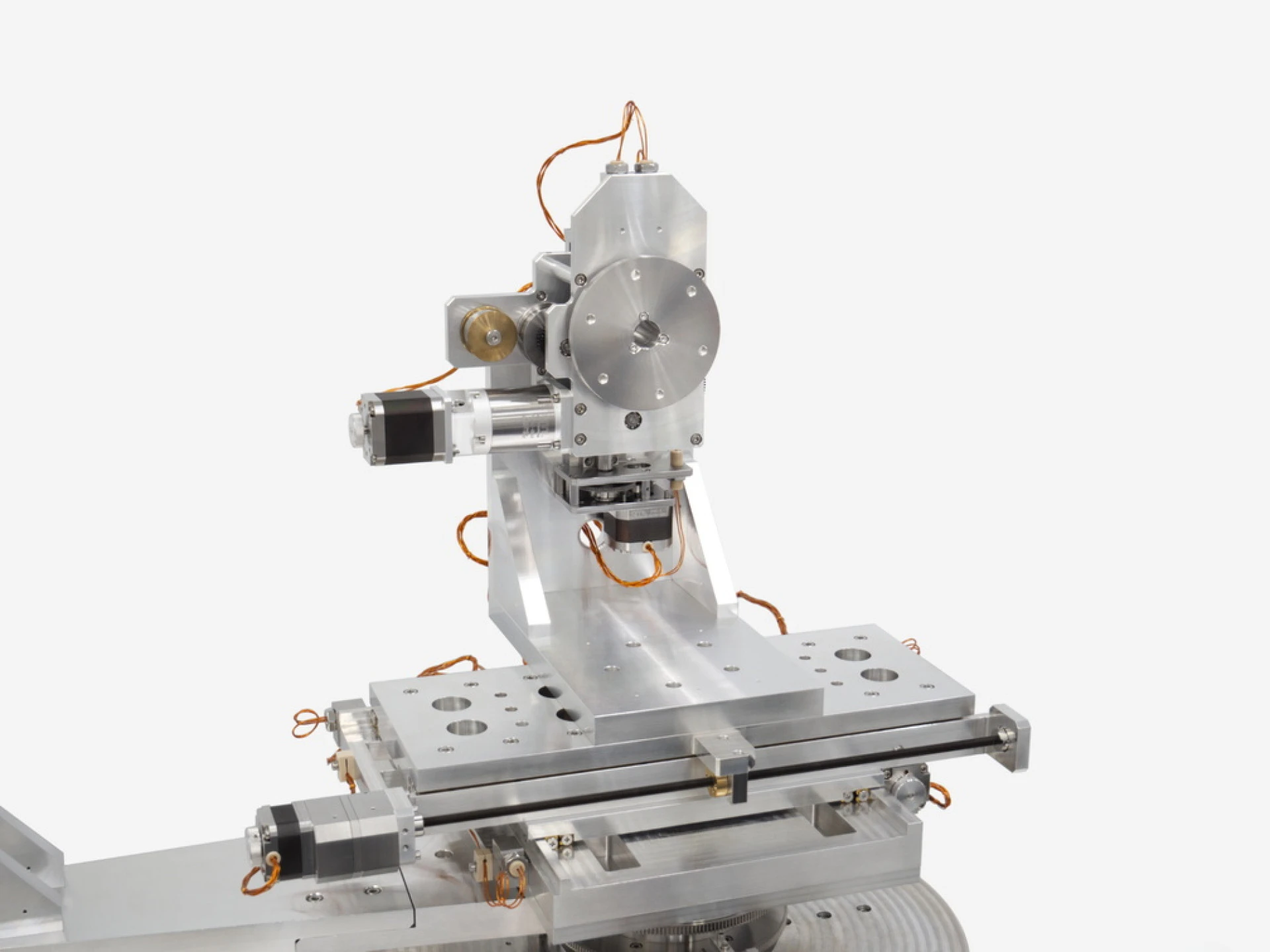 Custom Coaxial Rotation 2: The second custom rotation stage provides a rotational axis for the main body of the mechanism, including the following axes: X, Y, Z2 and R3. This rotation stage is independent of R1, which enables the sample mounted on R3 to be positioned independently of the detector arm, increasing the variety of configurations this mechanism can achieve.