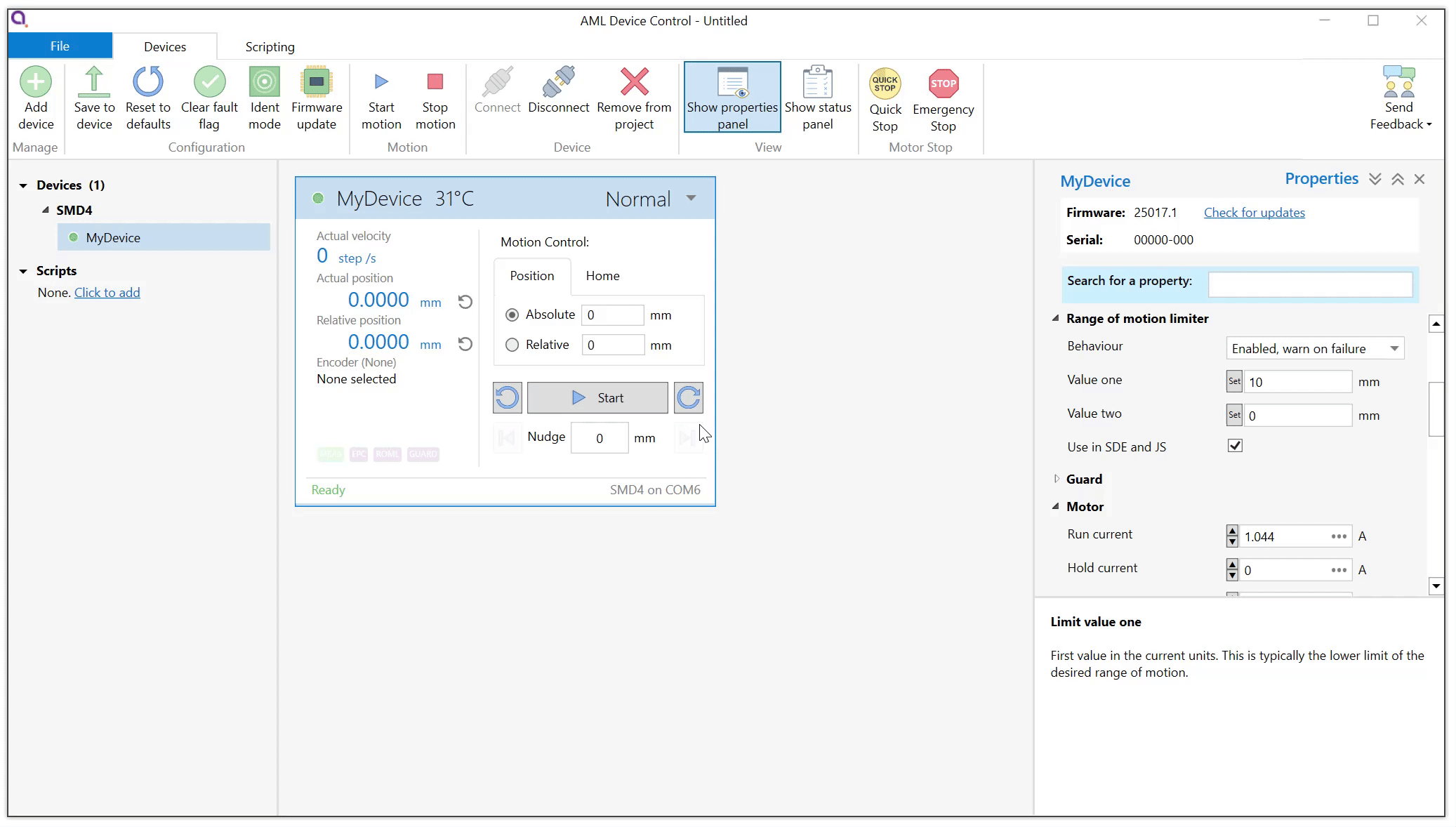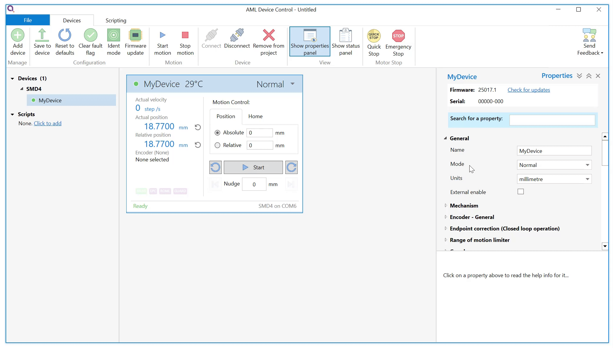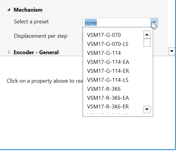 Configuring the drive for a new mechanism can involve entering a significant number of parameters. The latest SMD4 firmware comes loaded with default configurations for most AML mechanisms. Simply choose the required preset from a list in AML Device Control software, and a suitable default setup is applied. Users can start making movements right away in their chosen unit. Users can continue to refine the settings as required for their application and save the resulting configuration.