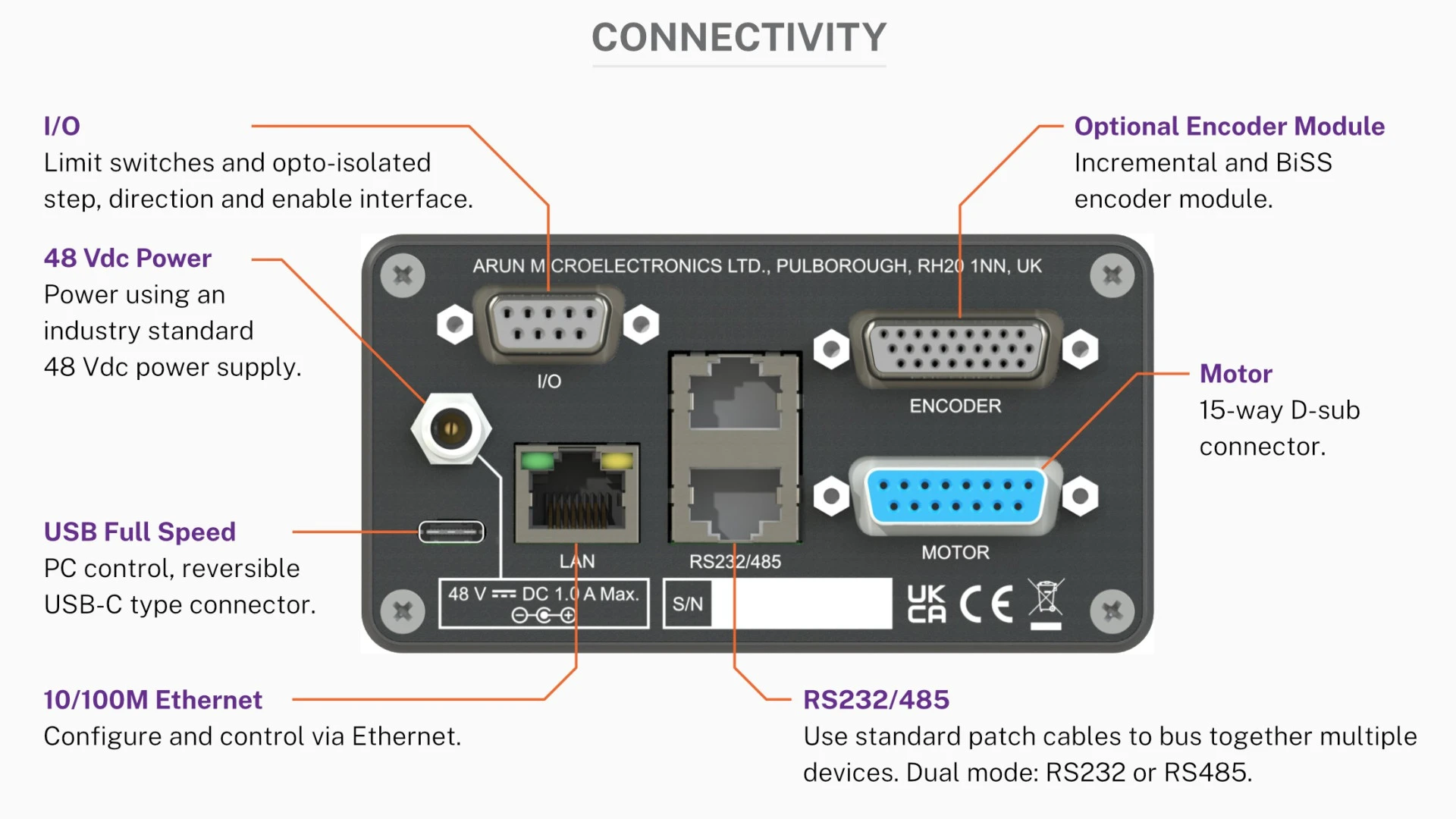 - Voltage boost feature: Power using a standard 48 Vdc power supply, and the drive voltage is boosted to 67 Vdc to maximise speed and torque