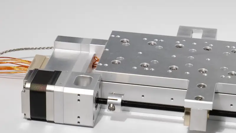 Linear translation stage suitable for use in UHV. Can support centred loads of up to 50 kilograms. Standard travels 100 mm. 5 µm resolution allows for precise in-vacuum motion.